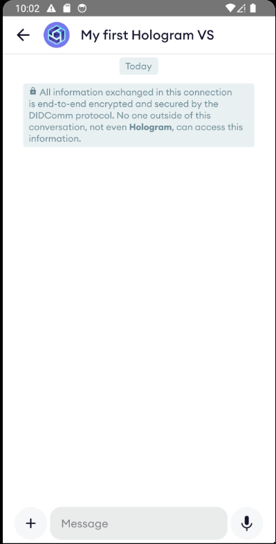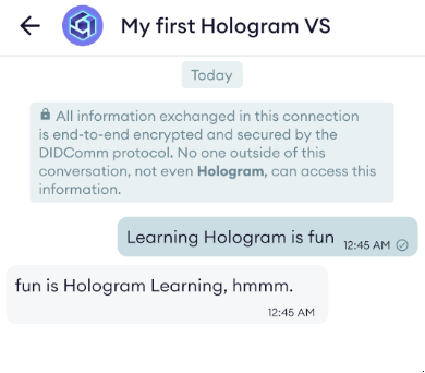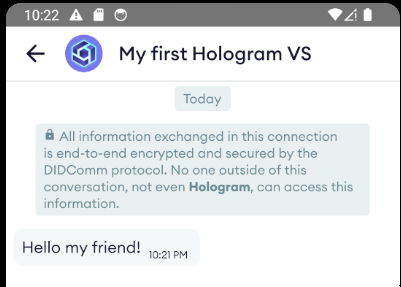 Allright: our user is connected to our VS through an end-to-end encrypted DIDComm connection. How can we interact with them? This is something we'll dive deeper in following tutorials, but let's see how we can easily identify them and send a text message, which is the simplest form of message we can send to Hologram.