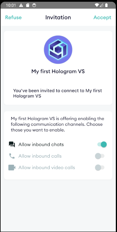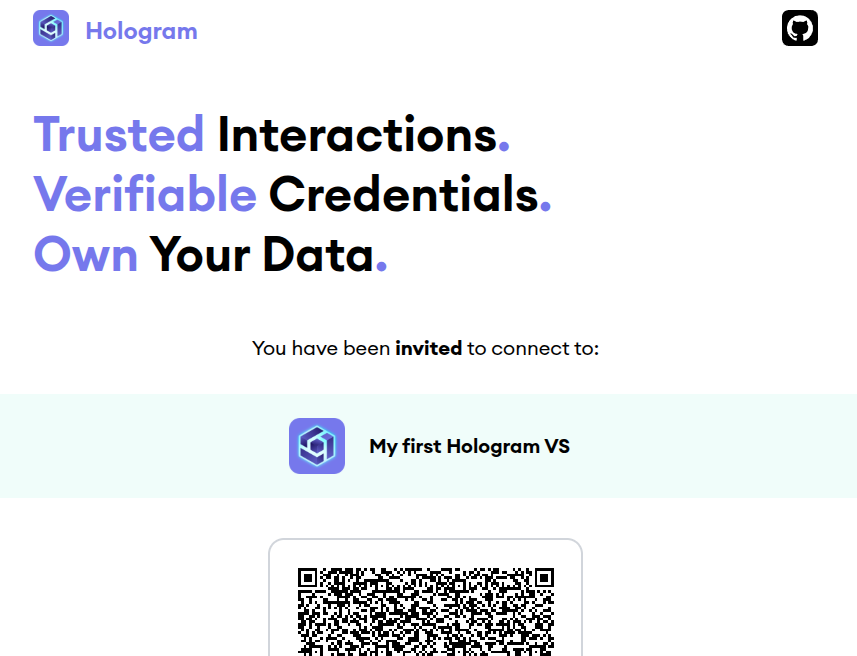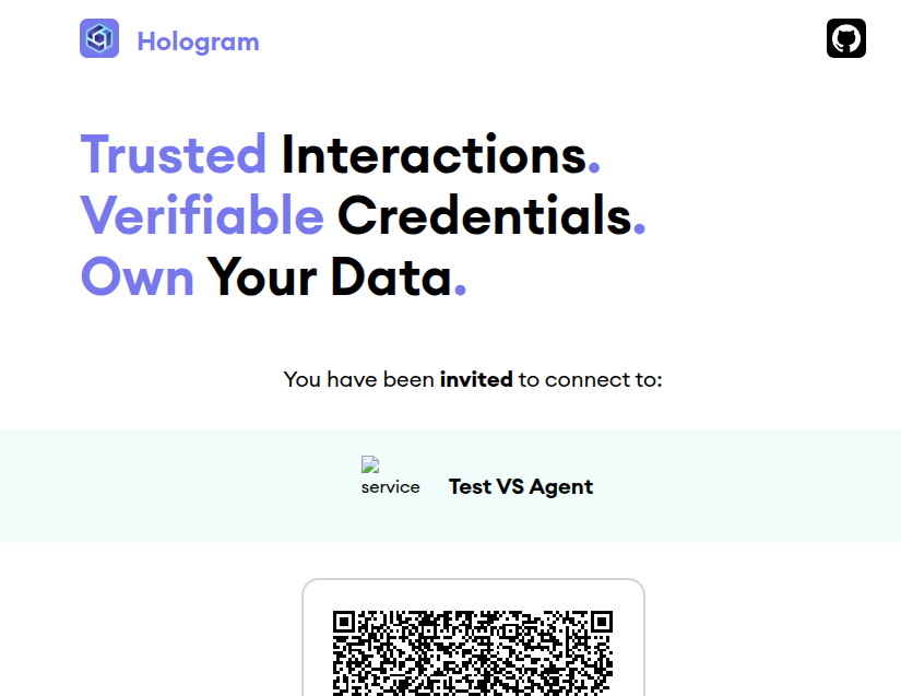 Now we have our VS Agent up and running, we can connect to it by opening in a web browser http://localhost:3001/invitation. This will redirect we to hologram.zone website with a QR code we can scan with Hologram.